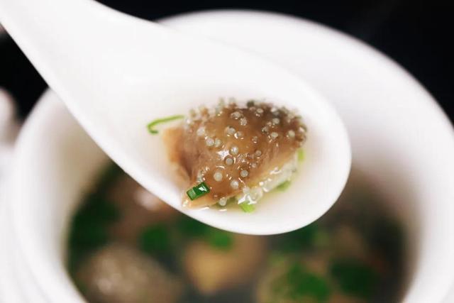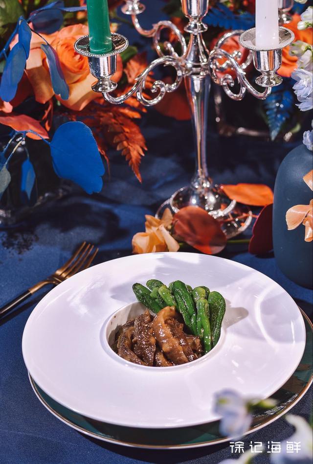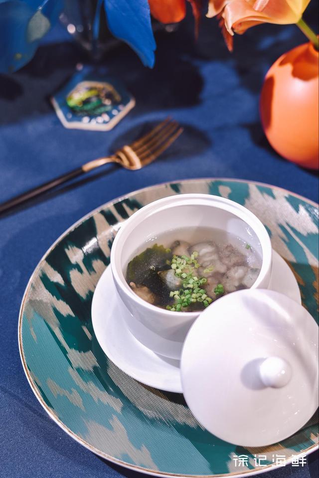 徐記海鮮的夏季新品【沖浪脆海參】,每一份都用足了4條海參,經驗豐富的大廚將海參一開4刀法切成8塊,讓食客很好入口。上桌后,將文蛤肉熬成的高湯緩緩倒入其中,整個過程如”沖浪”般,讓人感受到撲面而來的海洋氣息。
