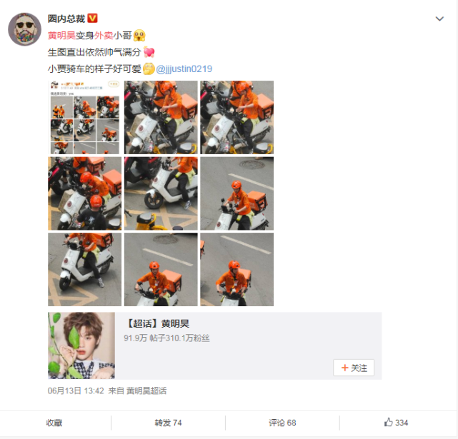 6月13日,“賈富貴”黃明昊現身長沙街頭,變身為跑腿小哥的一組照片走紅網絡。黃明昊身著UU跑腿工裝,化身跑腿小哥,騎上電瓶車奔馳在長沙的公路上。照片一出,瞬間引發粉絲舔屏大贊:“這么帥的跑腿小哥給我來一打!”“弟弟怎么出來干跑腿了,心疼弟弟!”