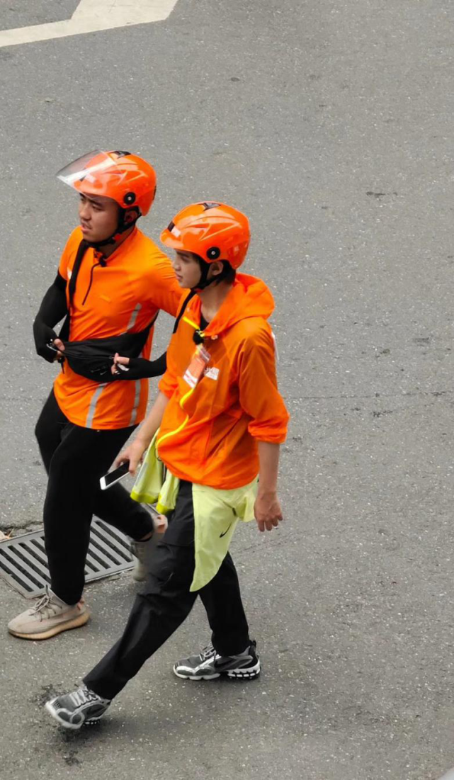 照片中,黃明昊身著橙色工裝上衣,黑色牛仔褲,騎上橙色電瓶車更顯可愛又英姿颯爽。送單出發前,黃明昊認真拿著手機看送單流程,對自己跑腿小哥這份工作格外認真。