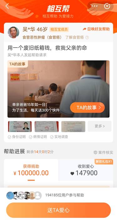 此前已有快遞員獲得相互寶救助,從事快遞工作15年的老吳去年底不幸查出食道癌,獲得了相互寶成員分攤的10萬互助金。除此之外,超10萬支付寶用戶還為老吳額外捐贈了10萬元善款,幫他緩解長期的醫(yī)藥費問題。