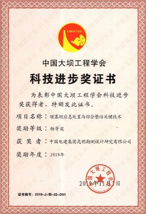 由昆明院依托工程牽頭完成的《堰塞壩應(yīng)急處置與綜合整治關(guān)鍵技術(shù)》榮獲中國(guó)大壩工程學(xué)會(huì)科技進(jìn)步特等獎(jiǎng)。
