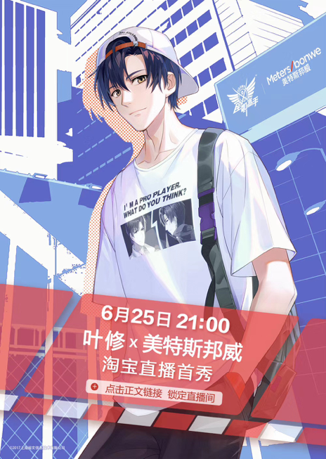 6月25日端午節(jié)當天,《全職高手》葉修現(xiàn)身美特斯邦威天貓直播間,進行直播帶貨首秀。在當晚長達一小時的直播間累計觀看人數(shù)超70萬,直播間點贊數(shù)近120萬次。