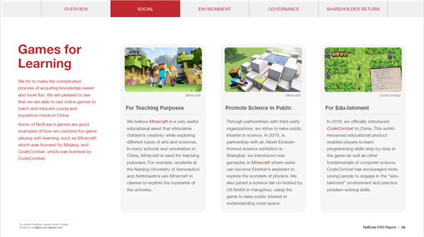 在網(wǎng)易上市 20 周年之際,網(wǎng)易就在今日發(fā)布了集團(tuán)的首份 ESG 報告(《環(huán)境、社會及管治報告》),收集、列舉了集團(tuán)和各業(yè)務(wù)在環(huán)境、社會、監(jiān)管合規(guī)和公益等方面做出的努力和影響。而游戲作為網(wǎng)易重要的業(yè)務(wù)模塊之一,在踐行 ESG 理念方面取得了不俗的成果。報告指出,網(wǎng)易通過營造公平的游戲環(huán)境建立玩家信任,并從防沉迷體系升級,切入游戲教育領(lǐng)域,培養(yǎng)公眾藝術(shù)審美品味和傳承傳統(tǒng)文化幾個方面落實并深化企業(yè)責(zé)任。