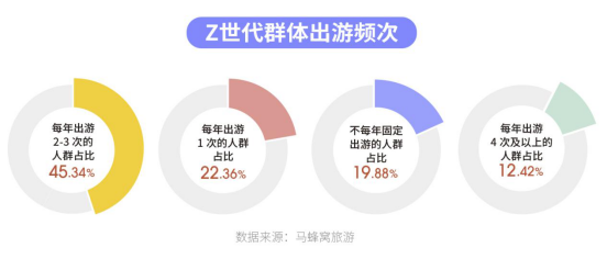 相比上一代旅行者,Z世代群體的旅行更加高頻,每年旅行2-3次的人群占比45.34%,每年出游4次及以上的人群占比也達(dá)到12.42%,這一比例遠(yuǎn)高于其他年齡段的群體。