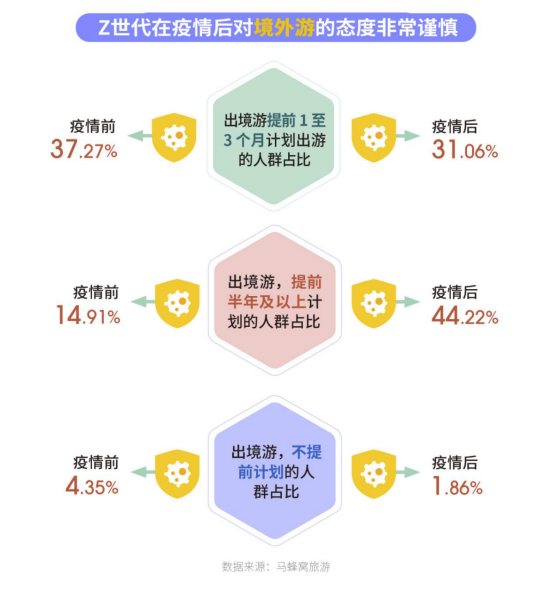 相比之下,Z世代對出境游的態(tài)度就非常謹(jǐn)慎。報告指出,多數(shù)年輕人的出境游計劃放在了半年乃至更久之后,提前半年以上進(jìn)行出境游計劃的人群占比從疫情前的14.91%驟增至疫情后的44.22%,而不提前做出境游計劃的游客占比則從4.35%降低至1.86%。