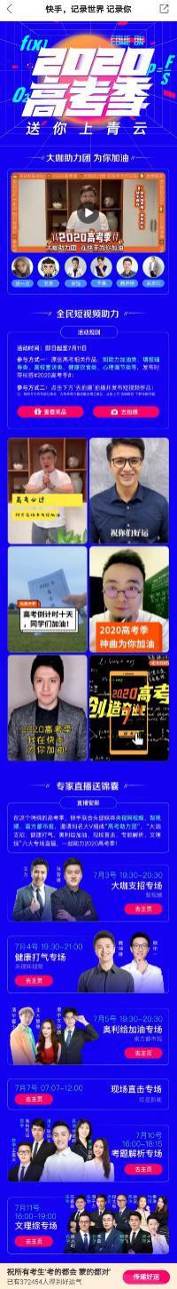 6月29日至7月11日,快手攜重磅優質流量、技術支持、資源聯動,策劃推出了為期13天的“2020高考季,送你上青云”活動。期間,快手邀請知名大V組成“高考助力團”與多家頭部媒體聯合,圍繞“大咖支招”、“健康打氣”、“奧利給加油”、“現場直擊”、“文、理綜專題解析”等主題,進行了六大專場直播,一起助力2020“史上最難”高考季。