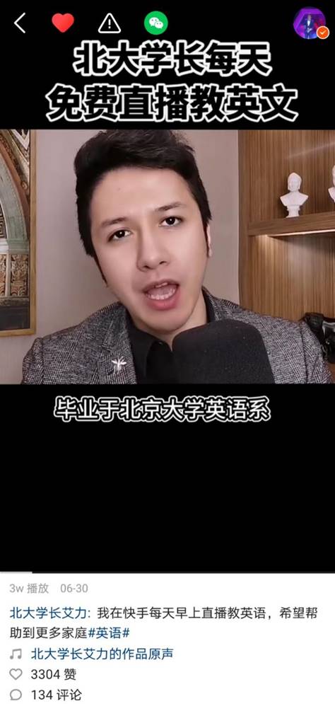 不僅限于本場直播,艾力學長在高考備考的這段時間,一直在為考生助力。每天早上6點半至7點半,艾力都準時在直播間免費教英語。在高考前夕,他還特意穿上北大的文化衫,祝福2020考生“金榜題名”。