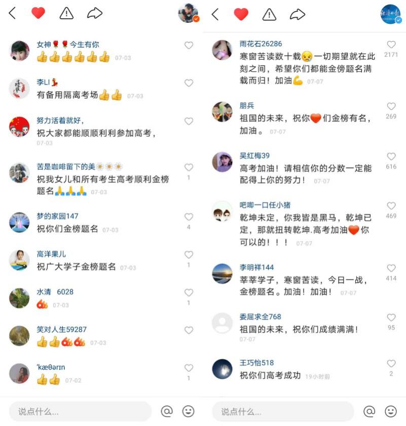 “希望孩子們金榜題名” “用最放松的心態去迎接挑戰” “所有人都在為高考讓路,孩子們加油啊”……任意打開標簽頁的一條視頻,評論區滿滿的鼓勵和666映入眼簾,老鐵們用快手獨有的方式向2020屆考生送去祝福。