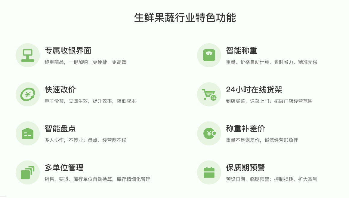 通過總結生鮮水果實體店的痛點,有贊零售生鮮果蔬經營系統發布了8大行業特色功能,包括:行業專屬的收銀界面、智能稱重、快速改價、24小時在線貨架、智能盤點、稱重補差價、多單位管理、保質期預警。