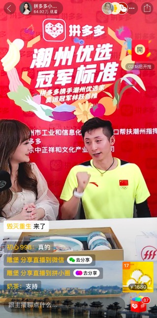 91萬人次觀看,261萬元銷售額——7月15日,奧運冠軍林躍走進拼多多“潮州優選 冠軍標準”直播間,為家鄉潮州品牌代言。潮州陶瓷、功夫茶具、智能潔具、美食特產,直播間內,潮州優選品牌產品悉數登場。在林躍的助力下,直播數據屢破紀錄。