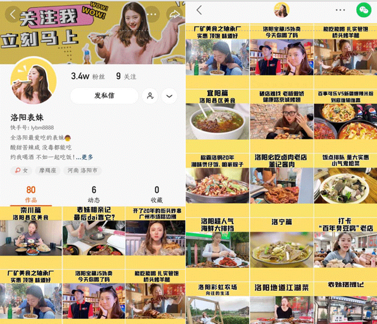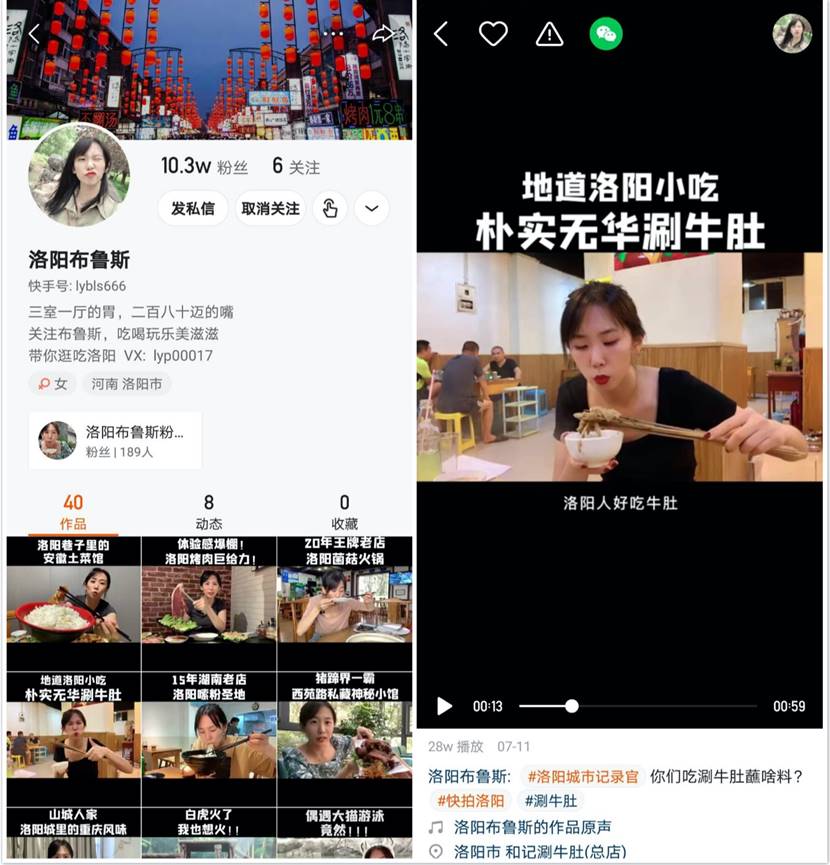 如果光看布魯斯的視頻還不過癮?再來“洛陽表妹”(快手ID:lybm8888)的賬號看看?自稱“全洛陽最愛吃”,無論是步行街的網紅店,還是巷子里的老字號,表妹通通來者不拒,酸甜苦辣咸,沒毒都能吃。怪不得有老鐵評價,“這妹子吃東西看著也太幸福了吧,再不開心看她的視頻心情都會變好?!?/p>