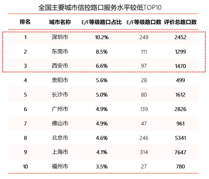 數(shù)據(jù)顯示,早晚高峰時(shí)段服務(wù)水平較低路口占比較大的城市主要分布在珠江三角洲,排名前三位城市分別為深圳、東莞和西安,占比分別為10.2%、8.5%、6.6%,深圳E和F等級(jí)的路口有249個(gè),東莞111個(gè),西安97個(gè)。