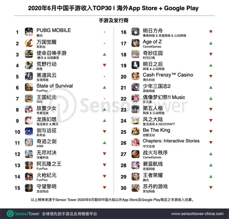 此外,據數據調研機構Sensor Tower數據顯示,2020 年 6 月期間中國手游產品在海外市場收入及下載量排名 TOP30中,騰訊《PUBG MOBILE》6 月海外收入近 7900 萬美元。2018 年 4 月開啟應用內購至今,該游戲在海外 App Store 和 Google Play 累計吸金 14.8 億美元。無獨有偶,莉莉絲《萬國覺醒》海外營收突破近 10 億美元;《State of Survival》,《守望黎明》和《Age of Z》三款末日生存 SLG 手游在海外共吸金 7350 萬美元,是去年 6 月份的 3.9 倍;有愛互娛《放置少女》在日本上市 3 年,憑借優質內容和優秀口碑,再次刷新紀錄,實現156%的同比上漲。