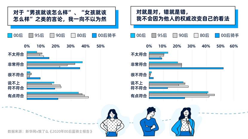 相比80、90后,00后群體整體對于外界所謂的權威和一些固有價值觀并不感冒。尤其是00后藍騎士,他們中超過半數“不會因為他人權威而改變自己的看法”。也因此在選擇工作時,00后群體更在乎這份工作“是否是自己喜愛的”。對00后藍騎士來說,這一點的重要程度甚至超過了“工資是否豐裕”。