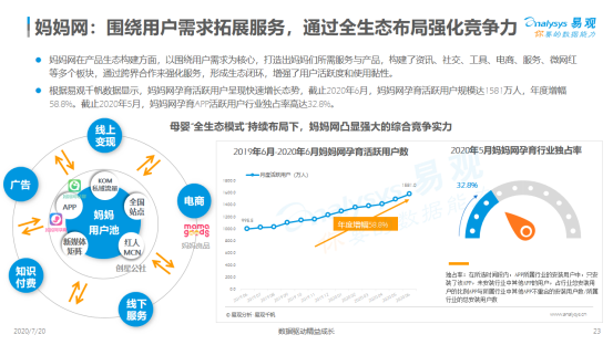 據悉,媽媽網在基于用戶需求拓展服務,提高競爭力之外,還在近兩年進行了強勢的品牌投放和用戶心智的占領,截止2020年6月,媽媽網孕育月活用戶規模達1581萬人,年度增幅58.8,獨占率占全行業第一。