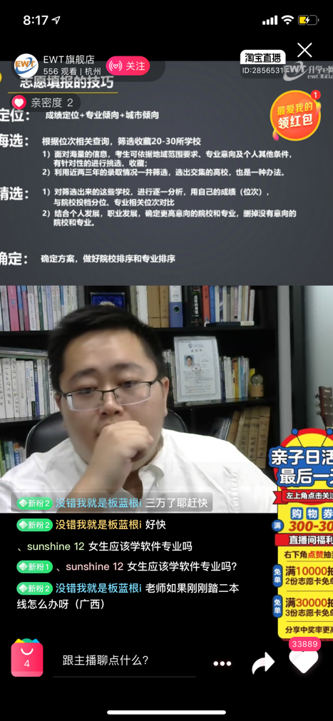 7月22日,“EWT志愿填報服務店”攜手淘寶教育上線了一場直播講座,在直播互動中,投檔原則、錄取案例、專業選擇等問題都是考生的關注重點: