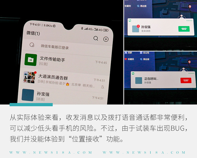 據工程師介紹,當手機微信收到好友發送的位置后,系統會自動推送到車機,然后通過騰訊地圖進行導航,省去了在車載地圖中輸入地址的麻煩。總的來說,這項功能還是非常實用,我們也期待在量產版車型上能體驗到該功能。