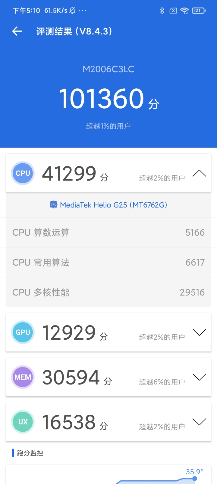 性能方面,Redmi 9A搭載了12nm工藝制程的MTK Helio G25處理器,采用8核A53架構(gòu),主頻最高2GHz,GPU為PowerVR GE8320。實(shí)測(cè),Redmi9A安兔兔跑分超過10萬分。