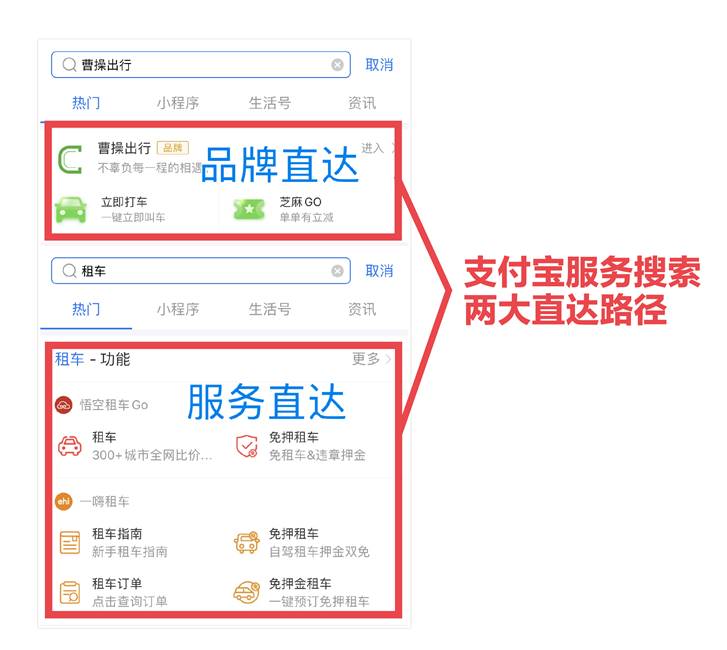 據(jù)了解,支付寶小程序數(shù)量已達(dá)200萬(wàn),月活超6億,搜索精準(zhǔn)匹配需求很有必要。2019年8月,支付寶小程序宣布開(kāi)放“服務(wù)直達(dá)”,在支付寶搜“快遞”、“租車”等功能服務(wù)關(guān)鍵詞,可直接呈現(xiàn)具備相關(guān)功能的小程序。2019年9月,“品牌直達(dá)”上線。目前,基于用戶最常用的兩類搜索習(xí)慣,支付寶已經(jīng)形成了品牌和功能服務(wù)全覆蓋的服務(wù)搜索直達(dá)。