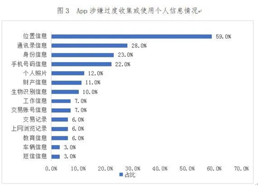 2018年中國消費者協會發布的《100款APP個人信息收集與隱私政策測評報告》顯示,100款APP中91款涉及過度收集用戶信息,其中位置信息、通訊錄信息、身份信息、手機號碼四種個人信息是過度收集最常見內容。
