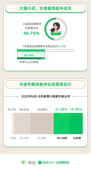 此外,小商家隊伍日益多元化,無論年齡性別,都通過微信支付實現智慧經營。4月至8月新增的微信支付小商家中,近三分之一為30-39歲小商家,中老年小商家也“種草”數字化經營,新增微信支付小商家中21.68%為40-49歲商家,18.89%為50歲以上商家。小店女老板撐起“半邊天”,7月活躍店主群體中50.1%為女性。