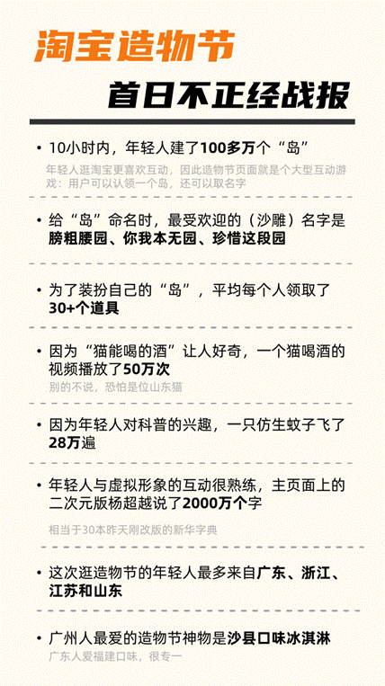 速途網8月11日消息(報道:李楠)今日,造物節(jié)發(fā)布了首日的“不正經數據”,集中展現了淘寶上年輕人的新特點:更愛逛神奇的店、更喜歡互動。像在給貓設計出特制酒的淘寶店里,網友看了50萬遍“貓主子”喝“酒”。還有百萬網友在淘寶造物節(jié)當起了“島主”——玩淘寶人生互動游戲玩得不亦樂乎。