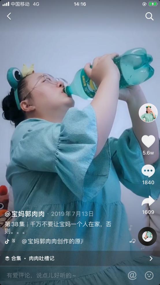 2019年7月13日,她在”寶媽郭肉肉”這個賬號發(fā)布了第一條視頻”千萬不要讓寶媽一個人在家”,講述產(chǎn)后寶媽一個人在家時,享受久違的零食、冰棍、雪碧……該條視戳中寶媽痛點,用輕松愉悅的方式展現(xiàn)了產(chǎn)后寶媽向往的生活,播放量達600W+,獲得5.6W點贊,近2000條評論,幫助”寶媽郭肉肉”賬號一躍成為母嬰行業(yè)”新代表”。
