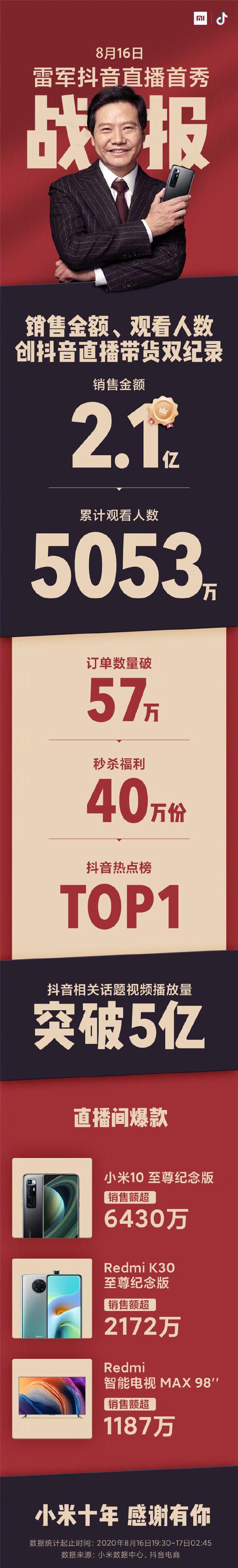 根據官方公布的數據看,雷軍此次直播中帶貨銷售金額為2.1億元,累計觀看人數5053萬,訂單數量超57萬單,秒殺福利40萬份。