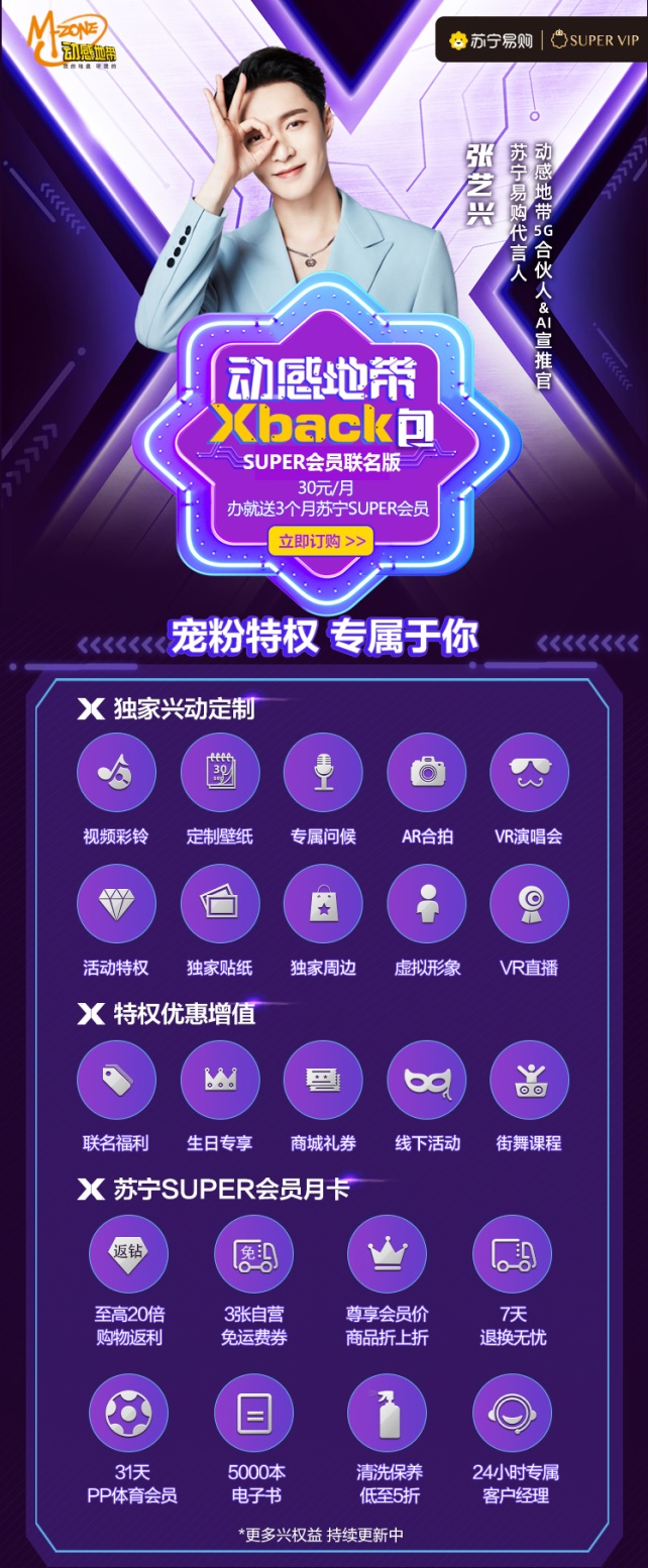作為張藝興入職中國移動推出的系列聯名產品,動感地帶Xback卡/Xback包不但價格親民,同樣也代表著年輕客戶群的潮酷態度。一直以來,“動感地帶”都致力于為年輕消費者打造一個潮流陣地。年輕的客戶群是中國移動動感地帶在5G時代最重要的增長引擎,也是蘇寧易購年輕化的重要潛在用戶。雙方聯手推出SUPER聯名版動感地帶Xback包,不但貼合張藝興粉絲們的喜好,也符合當下思想前衛、追求個性和熱衷新事物的Z世代年輕人的需求。