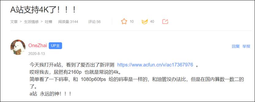 是的,近期不斷有A站粉絲發現, “Zarz蛋蛋解說”“愛否FView”等多位UP主的視頻列表中,出現了4K的內容,而距離上次官方低調通知升級1080P 60幀的通知,也僅僅過去才2個月的時間。短短幾十天,A站的視頻碼率技術竟然又實現了一次質的飛躍,觀看體驗和畫面效果還在持續提升,也難怪粉絲們感嘆:“我們的A站真有牌面!”