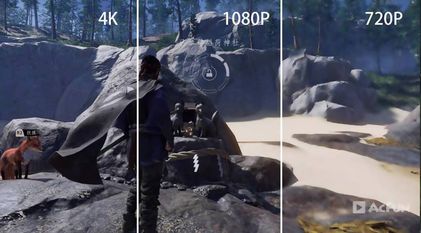 如上圖所示,我們可以很清晰地看到,最右面720P的畫面中草地都已經模糊了,這將使游戲效果大打折扣,很難讓用戶得到最真實的感受。