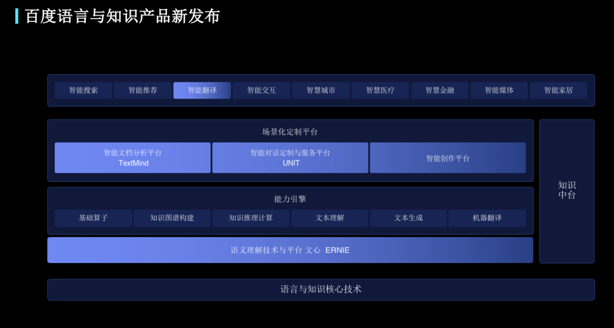 王海峰首次發(fā)布了百度大腦語言與知識(shí)產(chǎn)品全景圖。百度集團(tuán)副總裁吳甜接續(xù)發(fā)布語義理解技術(shù)與平臺(tái)文心、智能文檔分析平臺(tái)TextMind和AI同傳會(huì)議解決方案3大新產(chǎn)品,同時(shí)發(fā)布了6項(xiàng)升級(jí),包括智能創(chuàng)作平臺(tái)的3個(gè)場(chǎng)景方案、以及智能對(duì)話定制與服務(wù)平臺(tái)UNIT的3項(xiàng)全新升級(jí)。