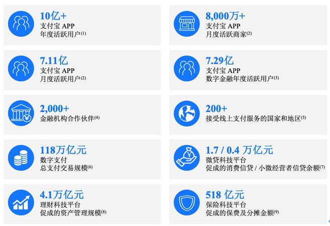 招股文件還披露,支付寶APP服務超過10億用戶和超過8,000萬商家,合作金融機構超過2000家,為全球最大的生活服務/商業類APP。按規模計,螞蟻集團是中國最大的數字支付提供商和領先的數字金融平臺,截止2020年6月30日的12個月內,在國內的總支付交易規模達到118萬億元,微貸科技平臺促成的貸款余額與理財科技平臺促成的資產管理規模分別達到2.1萬億元和4.1萬億元。