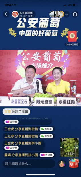 ▲8月28日,湖北公安縣縣長楊運春做客拼多多助農直播間,推介當地葡萄,近50萬網友圍觀拼單。