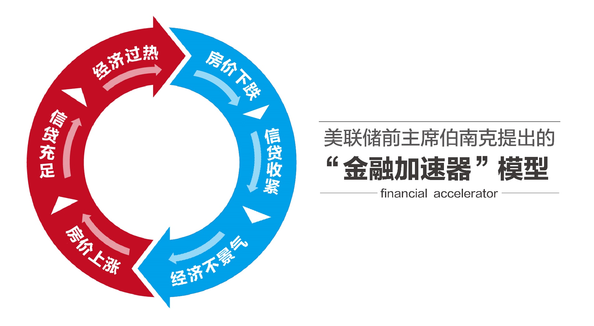 1996年,美聯儲前主席伯南克提出的“金融加速器”模型。具體來說,在經濟繁榮、房價上漲時期,房價升高,銀行會據此增加放貸供給,造成經濟過熱;而在經濟衰退時,房價下跌,商業銀行就會減少放貸,加劇經濟的蕭條。商業銀行抵押貸款的這種順周期特性,加劇了實體經濟的波動。從90年代的日本經濟危機到2008年次貸危機都印證了這一理論。