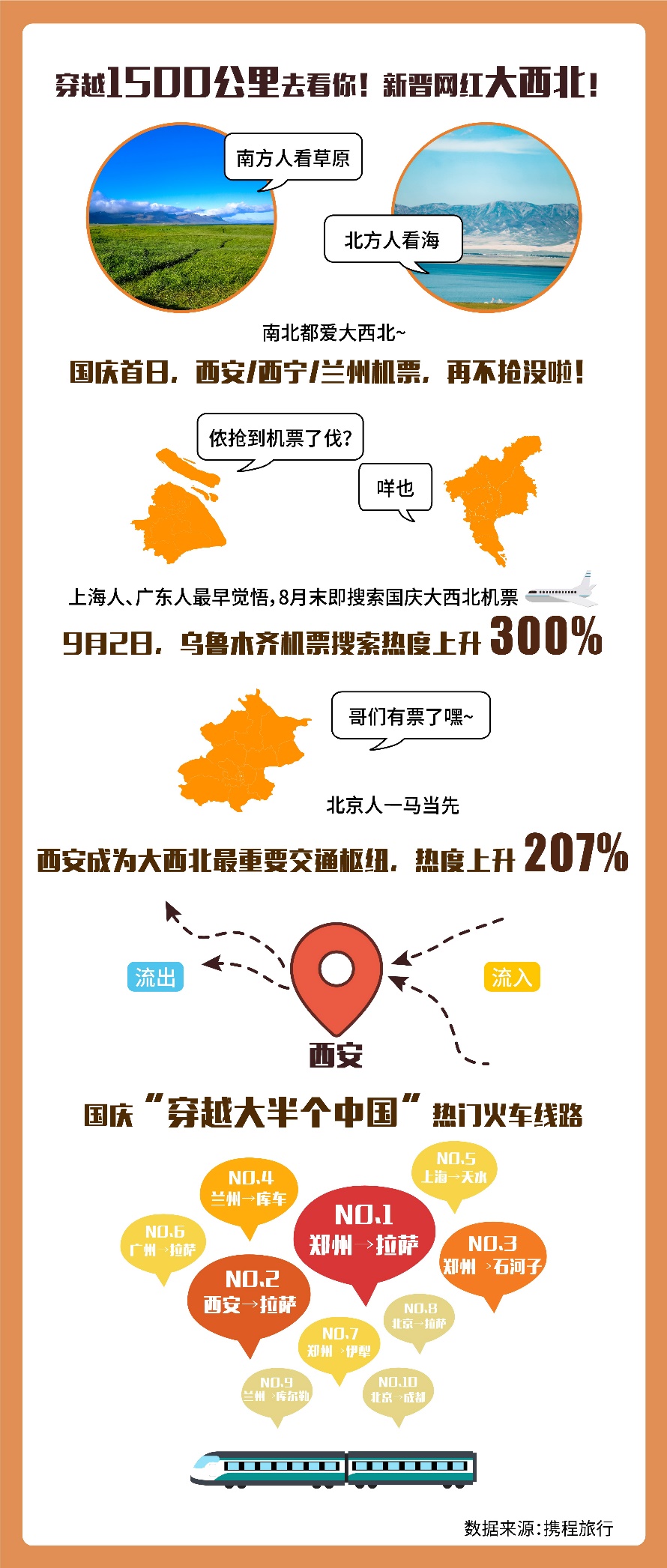 9月2日,烏魯木齊機票搜索熱度上升300%,北京人、上海人、重慶人、西安人搜索新疆機票熱度最高。西安成大西北最熱門國慶交通中轉樞紐,熱度上升207%。三亞、沈陽、哈爾濱旅客,“跨越大半個中國”飛往西安。很多旅客期待經由西安去拉薩、喀什。