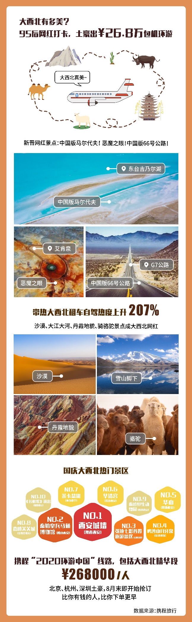 高凈值旅客也在關注大西北。價值26.8萬元的攜程“2020環(huán)游中國”線路,包括大西北精華段,北京、杭州、深圳土豪用戶,8月末即開始搶訂。比你有錢的人,比你下單更早。