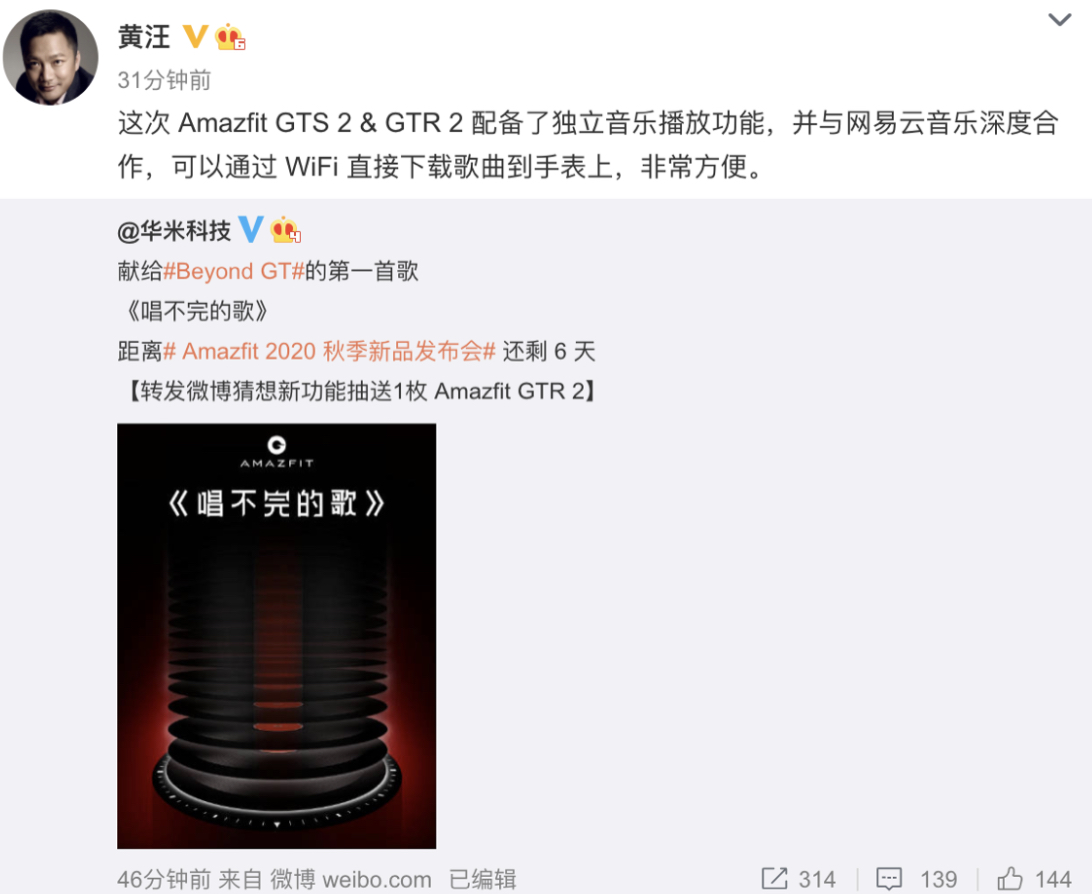 速途網9月16日訊(報道:喬志斌)今天上午,華米科技官方微博發布了首張倒計時預熱海報,宣告新品智能手表將搭載獨立音樂播放功能。隨后,華米科技CEO黃汪還透露了華米將與網易云音樂深度合作,直接將歌單導入手表中,享受更加個性化的音樂體驗。