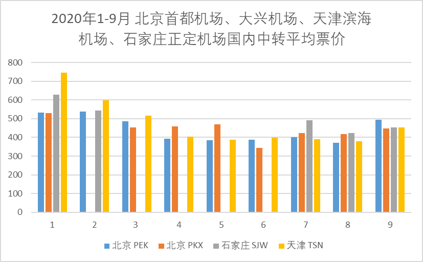 價格成為吸引旅客在大興機場中轉的重要原因。 去哪兒網數據顯示,2020年1月-9月期間,經由大興機場中轉的國內航班平均票價,低于北京首都機場、天津濱海機場和石家莊正定機場中轉票價。
