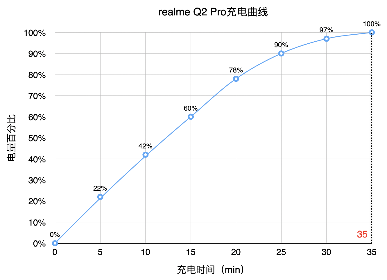 實測使用包裝內的充電頭為realme 真我Q2 Pro充電,15分鐘便可充電60%,0-100%充電共耗時35分鐘。使用生活中的碎片化時間,便可以快速為手機補充電量。