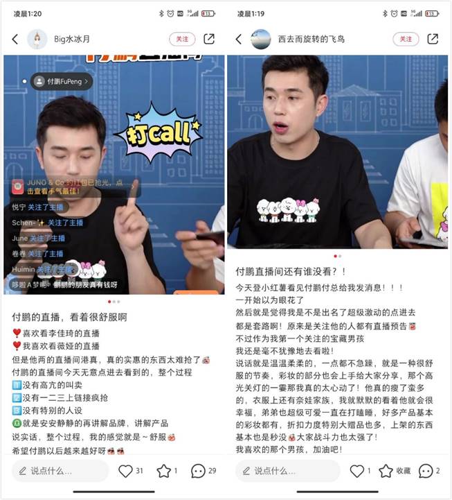 這種分享式直播頗受直播間觀眾好評,“很喜歡付鵬的直播,有條理,在帶貨的同時也在幫產品認真種草。”直播間有用戶評價。也有不少用戶在小紅書發表筆記,對付鵬的直播形式和態度表示贊賞。