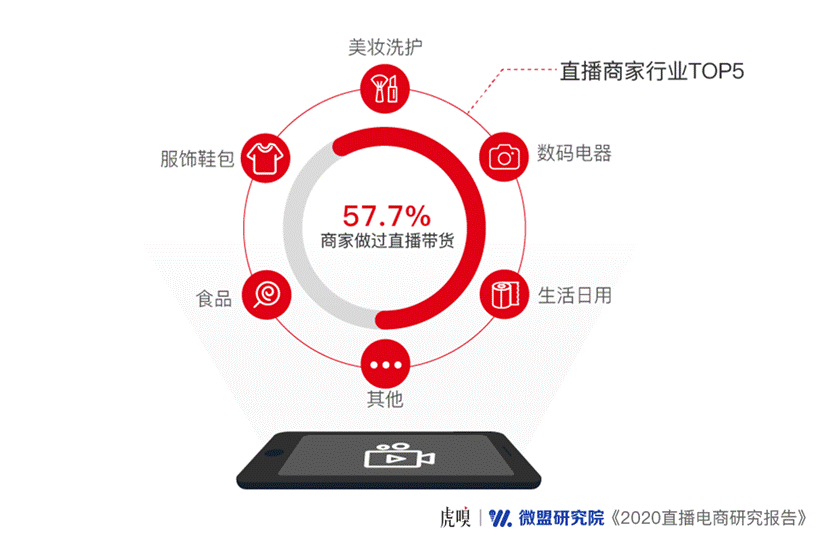 根據虎嗅聯合微盟研究院問卷調查,超過七成的用戶有過直播購物的經歷,認為通過直播可以對商品有更直觀的了解,且價格也相對實惠,能夠激發購買欲。超過一半的用戶每個月通過直播購物一到兩次。另有針對商家的調查問卷顯示,57.7%的商家做過直播帶貨,其中,服飾鞋包、美妝洗護、食品、生活日用、數碼電器五大行業是直播帶貨的熱門行業。