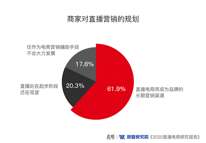 全平臺都在布局的背景下,商家也傾向布局多個直播渠道來增加引流曝光機會。虎嗅聯合微盟研究院調查表明,從在抖音、快手等直播平臺,到淘寶、京東等電商平臺之外,再到小程序直播這樣的“后起之秀”,都成為商家直播布局的主要渠道。關于對直播的運營規劃,超六成商家表示要將直播作為常態化營銷方式,每年投入固定資源進行發展。