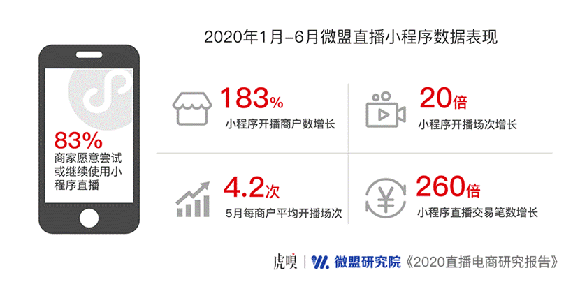小程序私域直播的優勢吸引了商家的涌入,官方數據顯示,自公測以來目前已有近10萬商家開通了小程序直播。虎嗅聯合微盟研究院調查問卷顯示,有83%的商家愿意嘗試或繼續使用小程序直播。微盟自有數據表明,2020年上半年微盟直播小程序平臺開播商戶數增長迅猛,截至2020年6月,小程序開播商戶數較1月增長183%,商家月均直播高達4.2次,開播場次增長超20倍,同時小程序直播交易筆數增長260倍,展現出出色的帶貨能力。