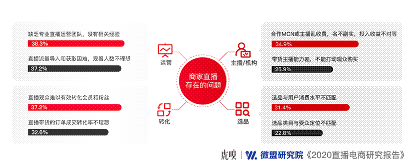 根據虎嗅聯合微盟研究院調查,商家直播運營的過程中存在諸多問題和難點,主要包括運營、主播和機構、轉化以及選品幾個方面的問題:自身組織和運營能力方面,缺少相關專業的人才和運營團隊支撐,缺乏經驗;粉絲轉化和訂單轉化不理想;選品與粉絲受眾定位以及消費水平不匹配;在與MCN機構、網紅主播的合作中,由于缺乏相關監管和規范,行業魚龍混雜,商家投入與收益不對等。因此商家做電商直播,亟需提升組織能力和精細化運營能力,同時,直播帶貨也需要相關的行業監管,實現規范化發展。