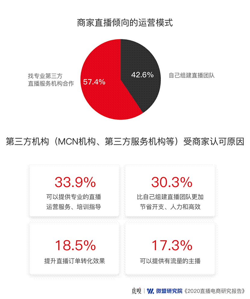 在此背景下,商家想靠自行組建直播團隊或孵化自己的主播難度比較大,商家更傾向于將專業的事交給專業的第三方服務商。根據虎嗅聯合微盟研究院調查,57.4%的商戶選擇找第三方直播服務機構來合作,主要看中其能夠提供專業的運營服務、有流量的主播以及節省開支、人力,提升轉化等等。而對于第三方機構來說,隨著市場對主播以及運營方要求也越來越高,完善服務能力,培育更多有帶貨能力的主播,是未來的核心競爭力。