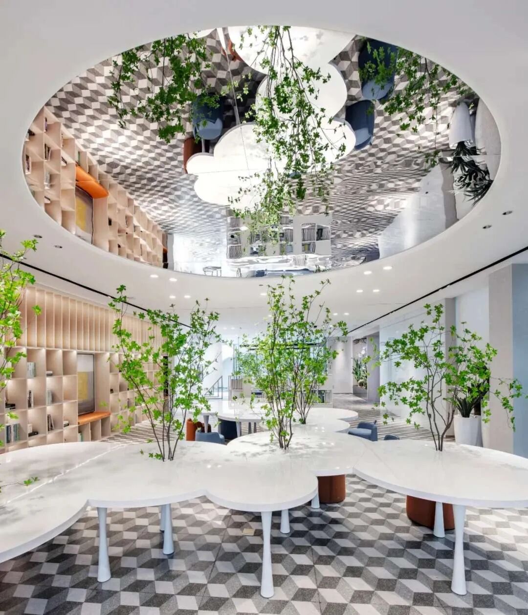 室內突破性地進行“少梁柱”設計,讓社區中心完全是開放、流動的空間,體現自然與建筑的交流。
