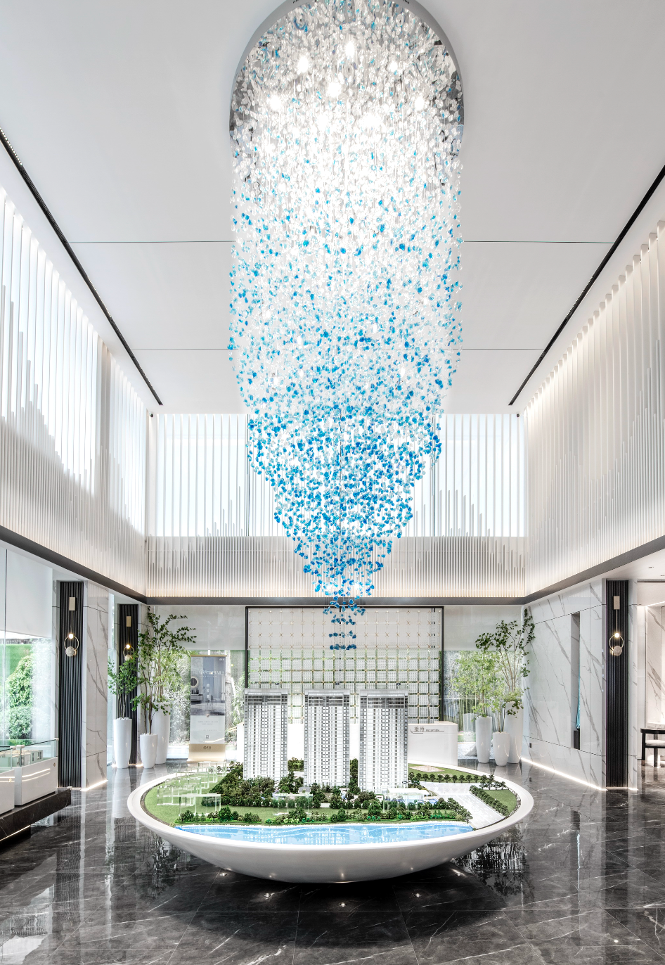 姿態各異的藝術雕塑演繹了藍調的輕盈與可塑性。通透的琉璃,淺淡的金屬亮面,都有藍色如夢似幻地浮動著,為空間增添溫柔氣息。