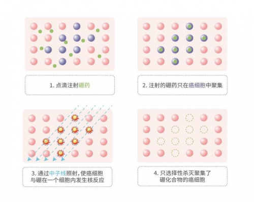 硼中子治療BNCT是一種放射線療法,與時下火熱的質子治療、重離子治療同屬粒子放療領域,其治療原理是利用硼元素(10B)與中子產生的核反應殺死腫瘤細胞。在BNCT治療中,先將攜帶10B的靶向藥物注射到人體,藥物特異性聚集于腫瘤細胞內,再對腫瘤部位用中子束進行照射治療,中子被硼俘獲產生核反應,釋放出兩個射程僅約10微米(約一個癌細胞大?。⒏呔€性能量轉移(liner energy transfer,LET)的重離子,使腫瘤細胞DNA雙股螺旋斷鍵,致使腫瘤細胞不可修復而徹底死亡,從而實現在細胞水平定點擊殺癌細胞而不損傷正常組織。簡單來說,硼元素就像是一個無害無毒的“特洛伊木馬”,通過親腫瘤的載體(攜帶劑)潛入癌細胞內,和中子束里應外合,一舉消滅癌細胞。