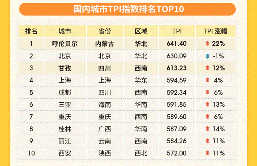 國慶黃金周以來,旅游經(jīng)濟(jì)穩(wěn)中向好的基本面進(jìn)一步穩(wěn)固,黃金周八天全國共接待國內(nèi)游客6.37億人次,實(shí)現(xiàn)國內(nèi)旅游收入4665.6億元,與端午節(jié)假期相比,恢復(fù)進(jìn)度分別提高了28%和39%。在旅游業(yè)穩(wěn)步復(fù)蘇的同時(shí),人少景美的中國“新秘境”成了廣大游客的首選目的地。報(bào)告顯示,曾上榜馬蜂窩2020“中國新秘境”榜單的呼倫貝爾和甘孜,分別位列第三季度國內(nèi)城市TPI榜單的第一名和第三名,TPI指數(shù)超越眾多傳統(tǒng)熱門旅游城市。西寧、酒泉、阿壩等眾多新秘境榜單中的城市也入圍國內(nèi)城市TPI指數(shù)的TOP20。此外,作為“中國新秘境”城市的吉林遼源,TPI指數(shù)上漲40%,山西朔州TPI指數(shù)上漲46%,均居于所在區(qū)域城市TPI漲幅榜前列。